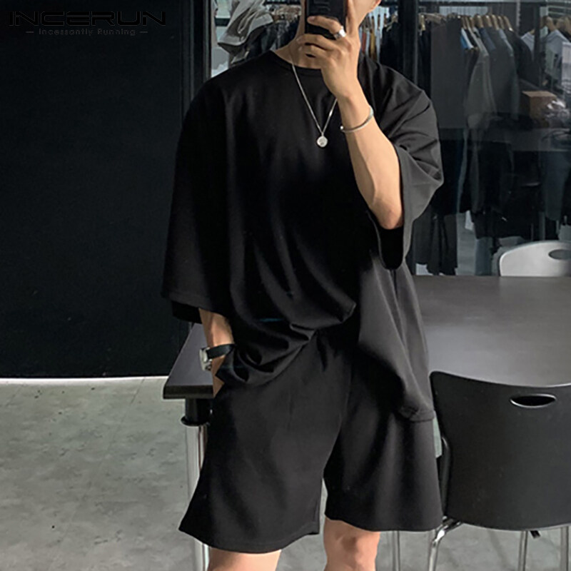 INCERUN Mens Shorty Pajamas Sets Nightwear Japanese Loose Fit Tops Shorts Sleepwear Suit (Korean Style)